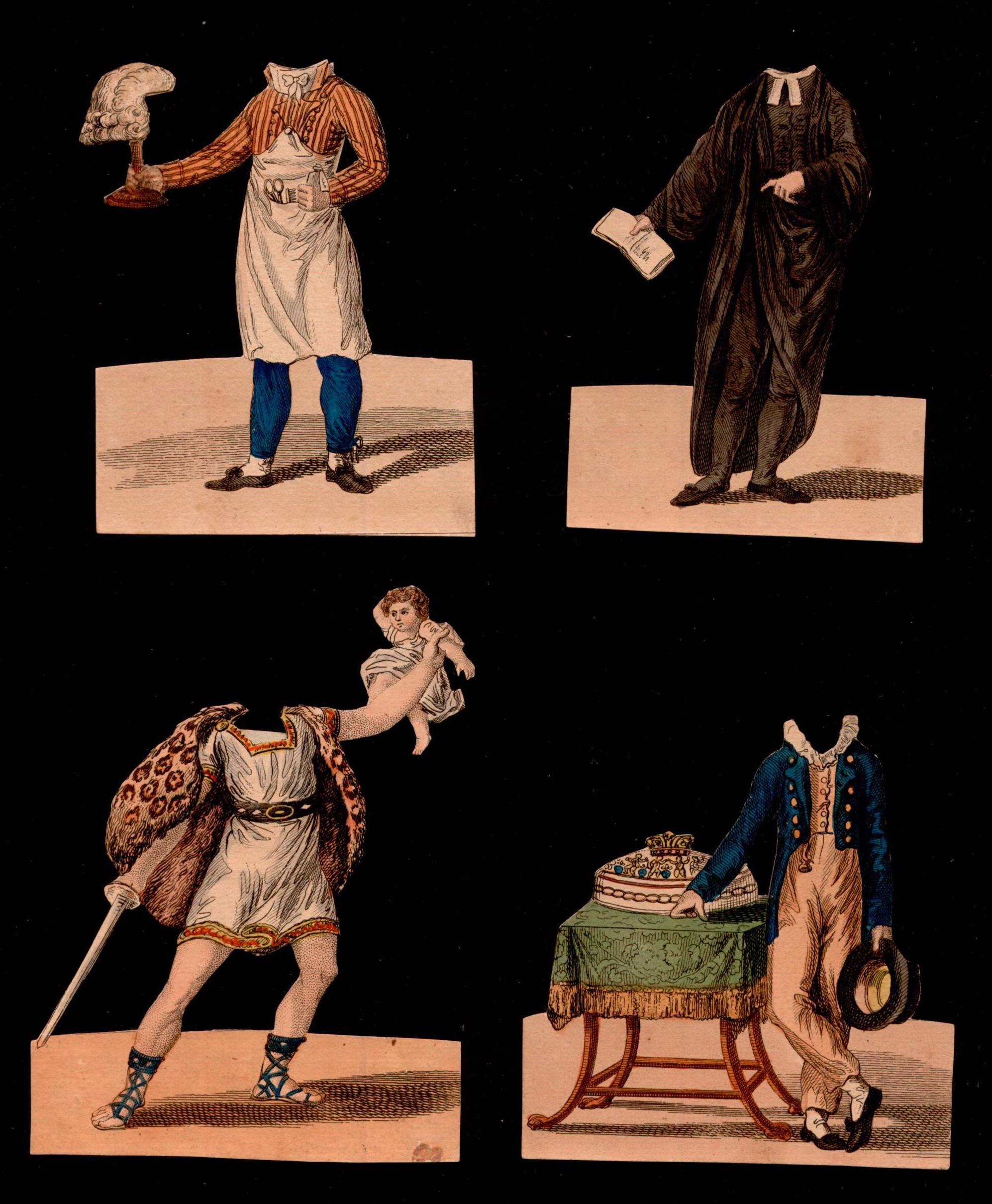 Verwandlungen steht auf dem marmorierten Schuber, in dessen Innerem sich ein Heft mit acht gestanzten, kolorierten Puppen befindet. Dazu gibt es einen Kopf sowie einige Kopfbedeckungen, die darauf montiert werden können. Erzählt wird die Geschichte von Fritz Sinnreich, der für seine Freunde auf einem Fest in sieben Rollen schlüpft: König, peruanischer Kämpfer, Friseur, Harlekin, Schotte, Jude, Advokat. Das Verwandlungsmotiv gehört zu den ältesten der Literatur und beschreibt, dass die Gestaltenwelt der Götter, Menschen und Tiere durchlässig ist.