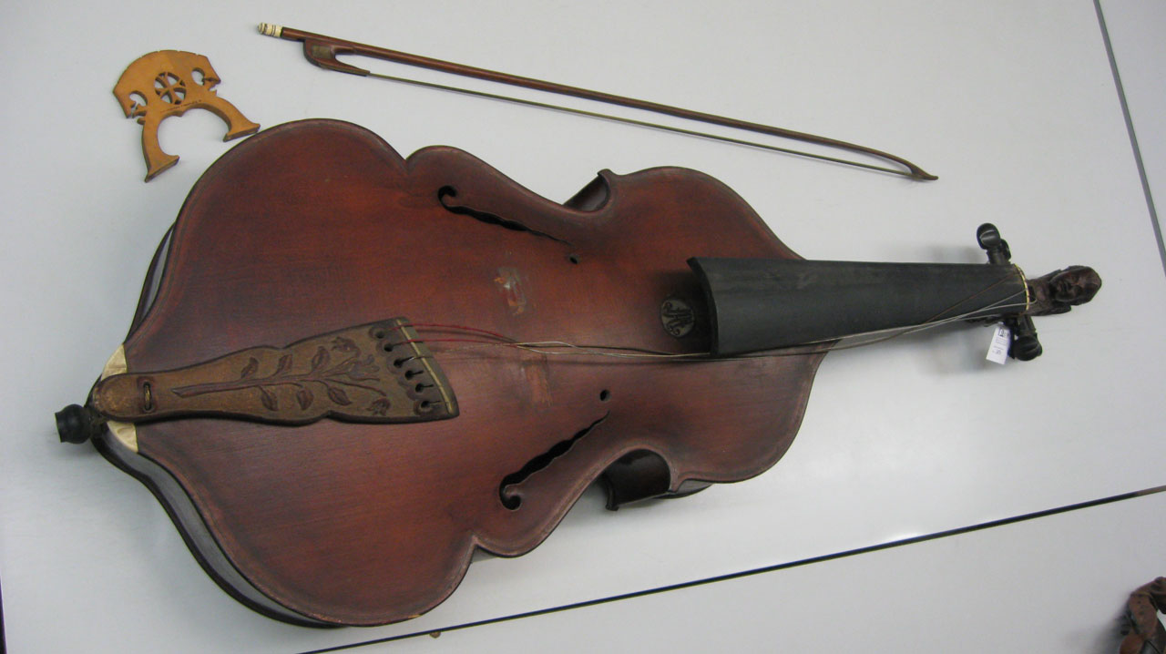Tritt man einen Schritt zurück und betrachtet das Instrument genauer, sieht es zunächst aus wie ein altes Violoncello, das schon bessere Zeiten erlebt hat. Drei Saiten baumeln lose über einem verschrammten und etwas staubigen Corpus.