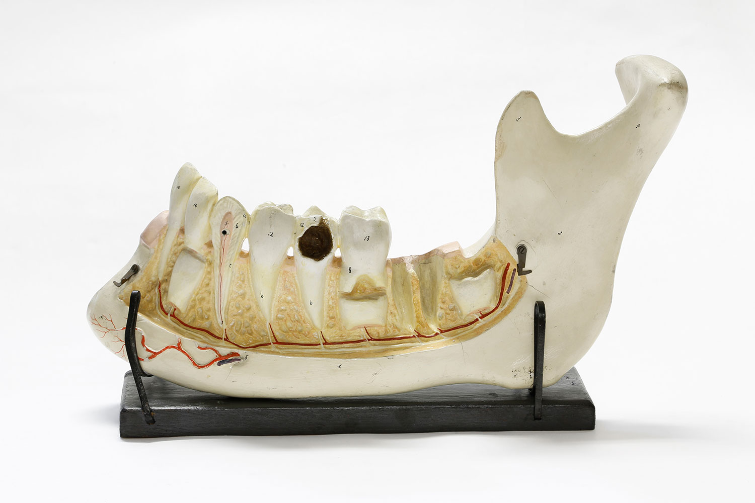 Die deutsche Firma Somso in Sonneberg stellt seit 1876 anatomische Lehrmodelle her, die ursprünglich aus Papiermaché, später aus Gips und heute aus Kunststoff bestehen. Das große Gipsmodell aus den 1920er-Jahren zeigt verschiedene Wachstums- und Verfallsmomente von Zähnen. Im Kiefer verbergen sich die heranwachsenden, frischen Zähne, die bald die oberen herausstoßen werden, während der von Karies zerfressene Zahn auf die Vergänglichkeit des Gebisses hinweist. Mit einer zweiten separaten Platte konnten die untere Hälfte des Kiefers und die Zahnwurzeln abgedeckt werden.