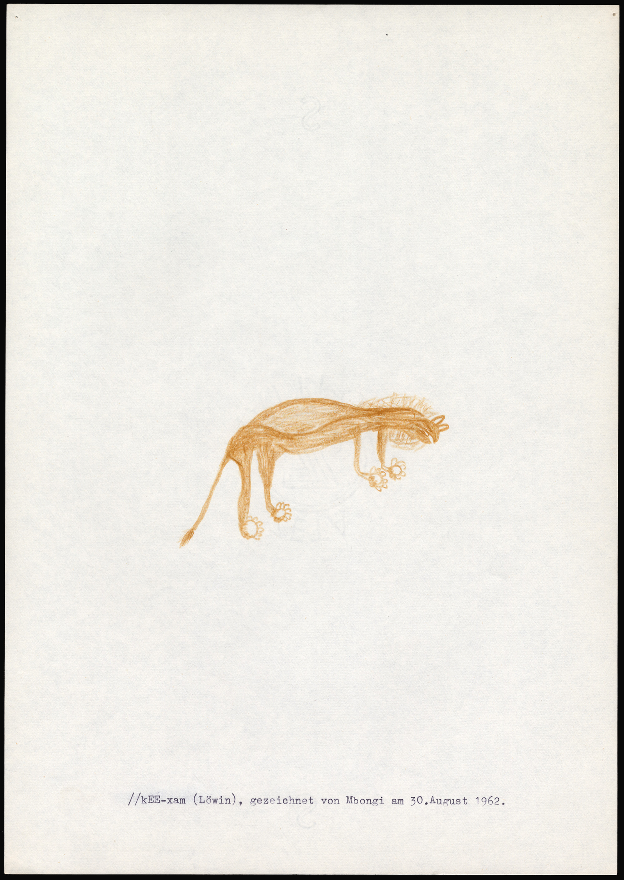 ... fertig ist das Mondgesicht. Ein einfacher Spruch, der als Anleitung, zum Zeichnen eines Gesichtes dient. Fast jeder hat als Kind schon einmal das bekannte Mondgesicht gemalt. Mit nur vier Strichen konzentriert sich die Zeichnung auf die wichtigsten Elemente eines Gesichtes. Auch sonst wird in einer Kinderzeichnung häufig das auffälligste Merkmal besonders hervorgehoben. Zum Beispiel der lange Hals einer Giraffe, der Rüssel des Elefanten oder die Mähne eines Löwen. Der hier gezeichnete Löwe befindet sich im Oswin-Köhler-Archiv an der Goethe-Universität. Die Zeichnung auf dem Papier sieht etwas unbeholfen aus, der Körper ist ungleichmäßig gezeichnet. Die Beine des Tieres erscheinen hinten etwas zu groß und vorne etwas zu klein geraten. Auch der Kopf ist in keinem naturalistischen Maßstab gezeichnet. Aber es scheint, als habe das Tier eine Mähne, die Haare am Hals weisen darauf hin. Der Schwanz des Tieres ist dünn und am Ende ist ein Haarbüschel zu erkennen. Die Pfoten sind in einer seltsamen Perspektive gemalt, als sähe man sie von unten, sie scheinen nicht recht zu dem restlichen Tier zu passen, sondern angesetzt zu sein. Am unteren Rand des Papiers ist in Schreibmaschinenschrift zu lesen „//kEE-xam (Löwin), gezeichnet von Mbongi am 30. August 1962.“